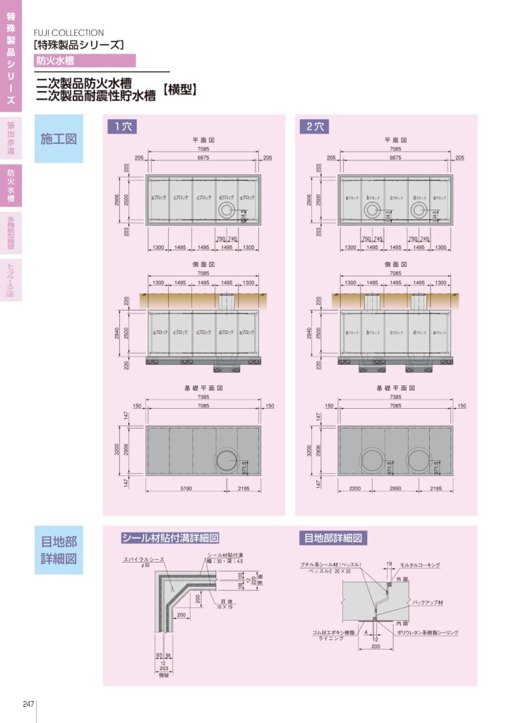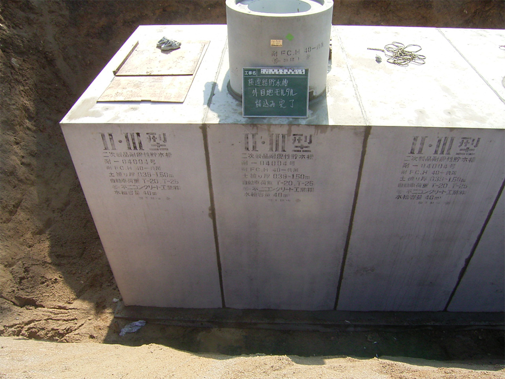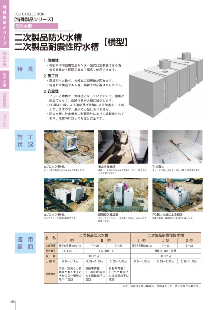 PC鋼より線による連結と樹脂による防水加工で漏水リスクを低減。防火水槽・貯水槽ともに耐震設計で地震時も安全。