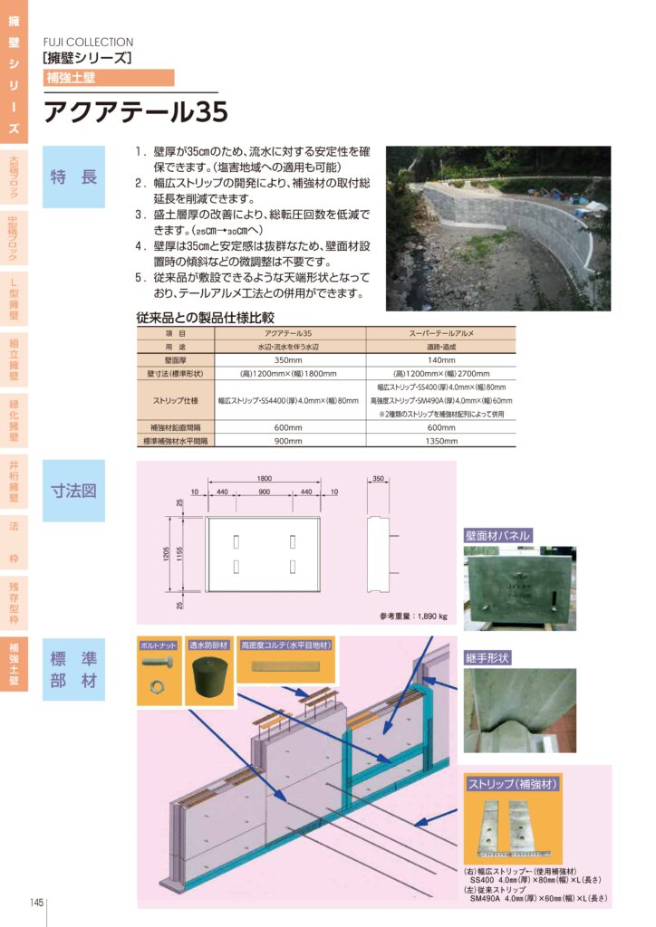 従来品が敷設できるような天端形状となっており、テールアルメ工法との併用ができる