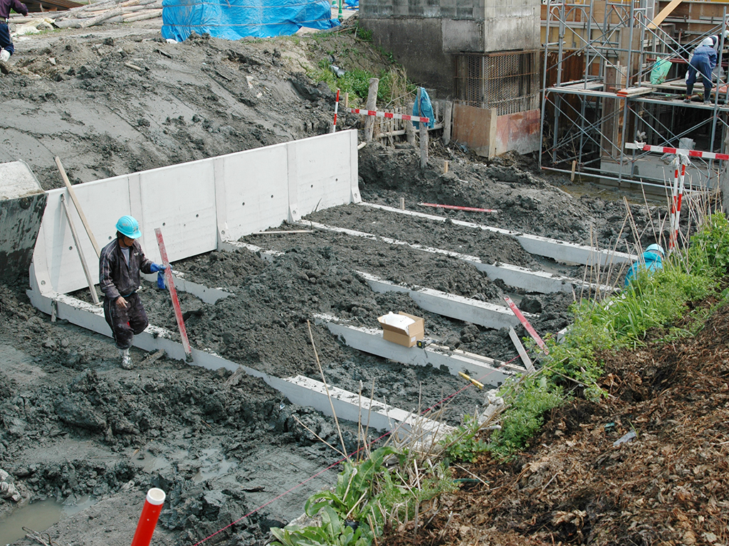 「板」の転倒防止機能によって、埋め戻しまでの施工性が向上し、また施工後に背面土砂が沈下した場合でも板の転倒を防止する