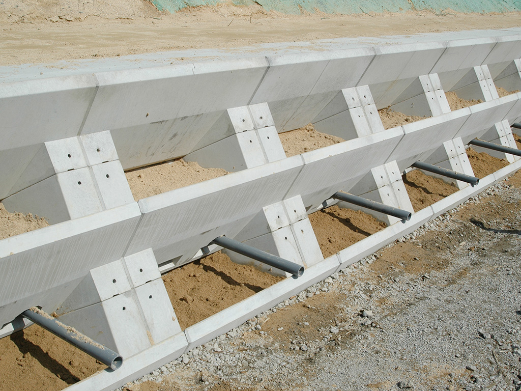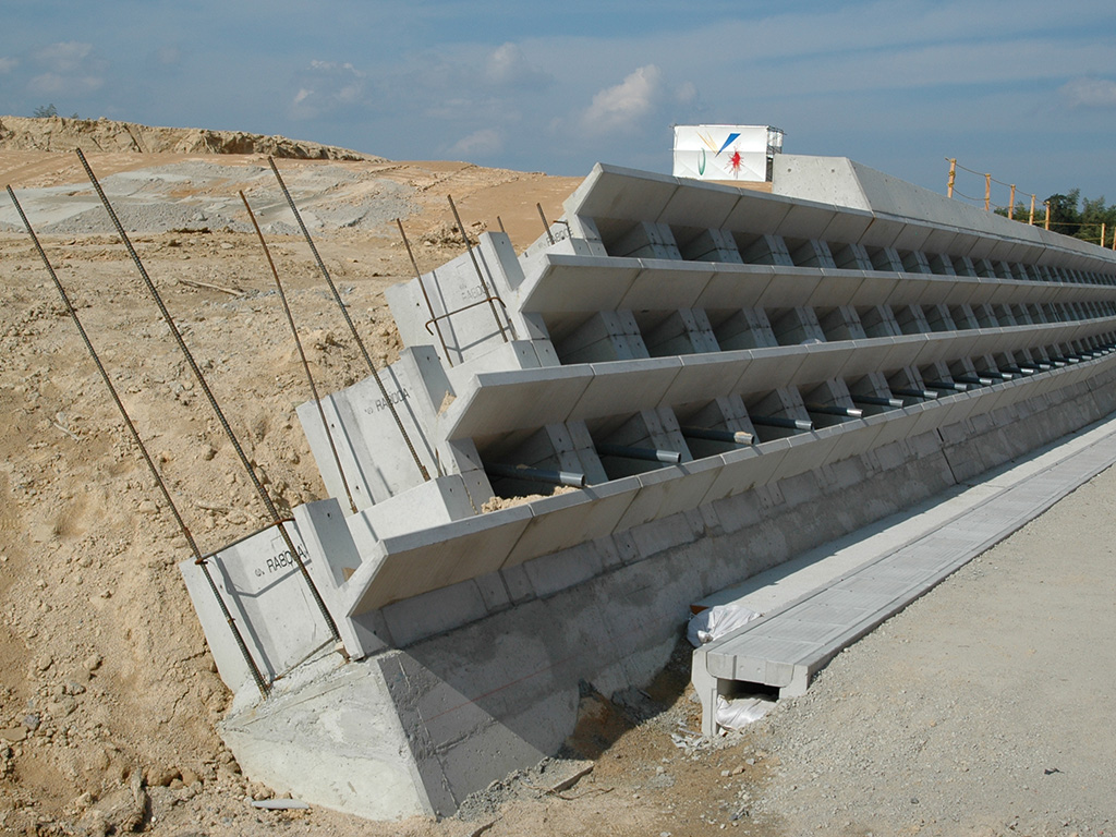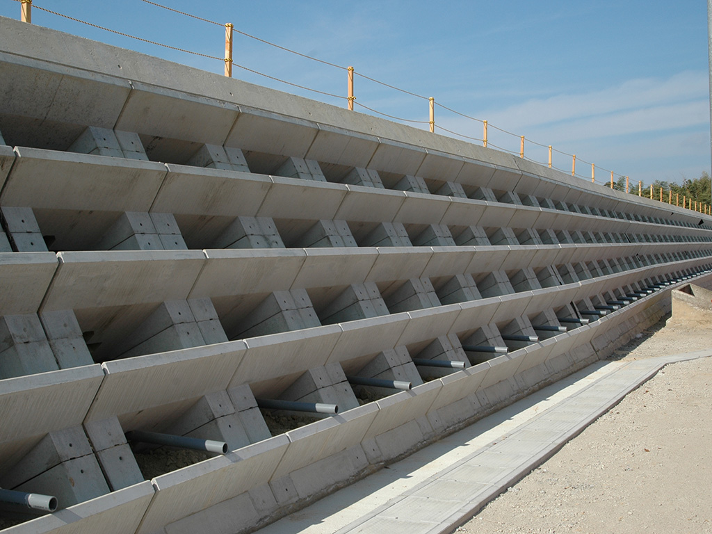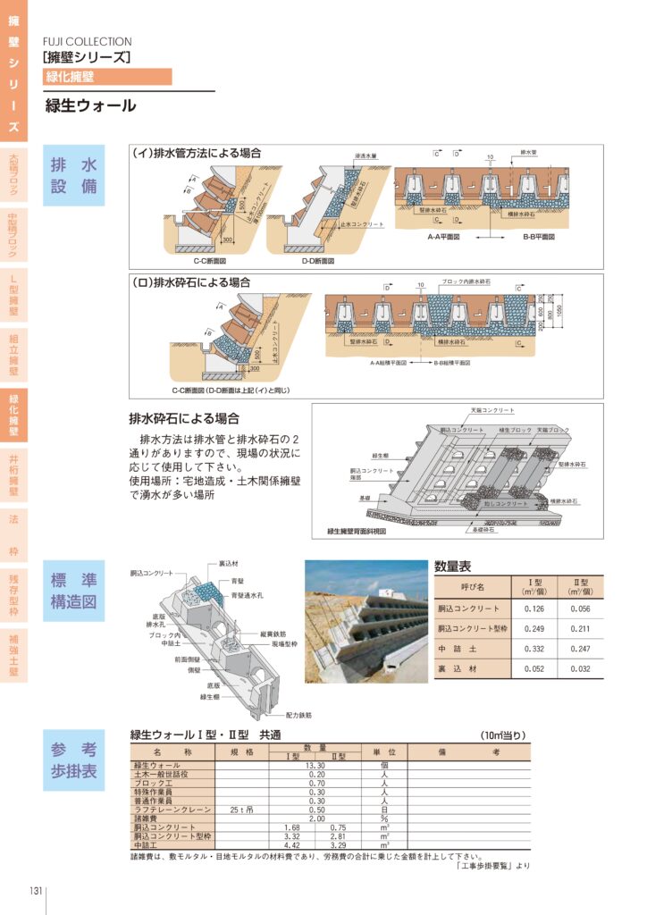 植生部はポット式になっており、隣接する製品間に胴込コンクリート及び縦貫鉄筋を設けることにより、強固に一体化された擁壁となる