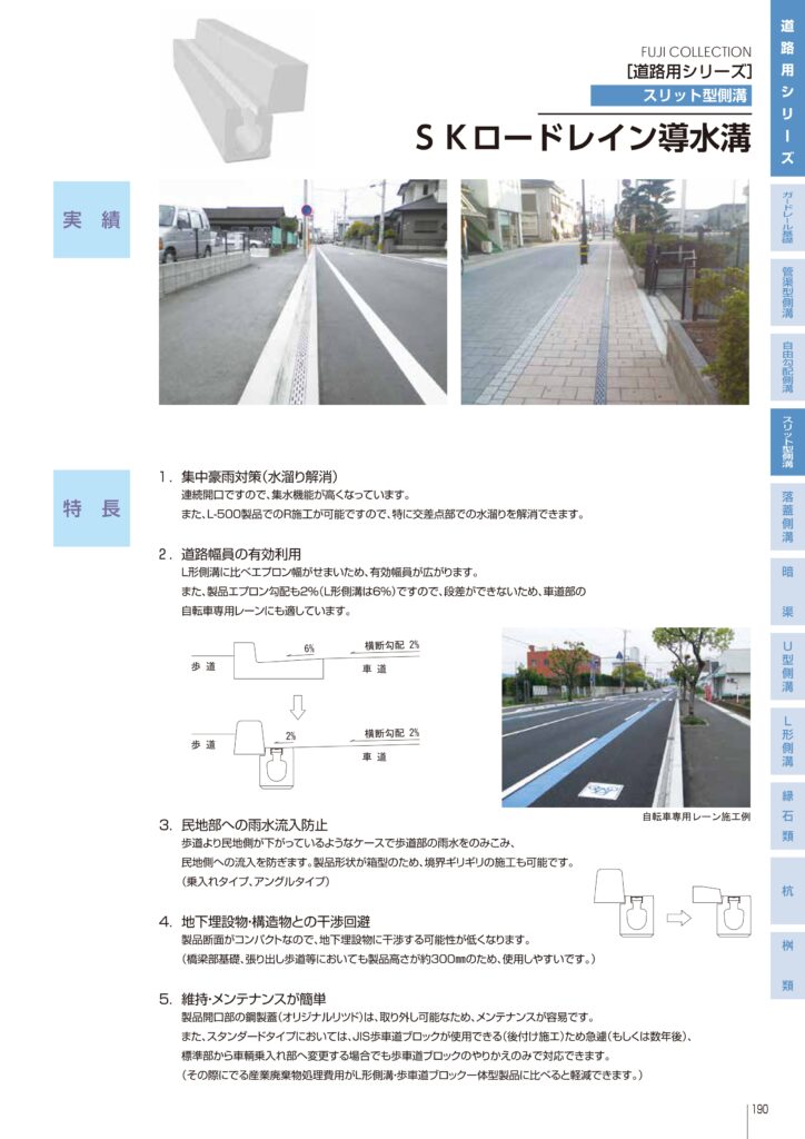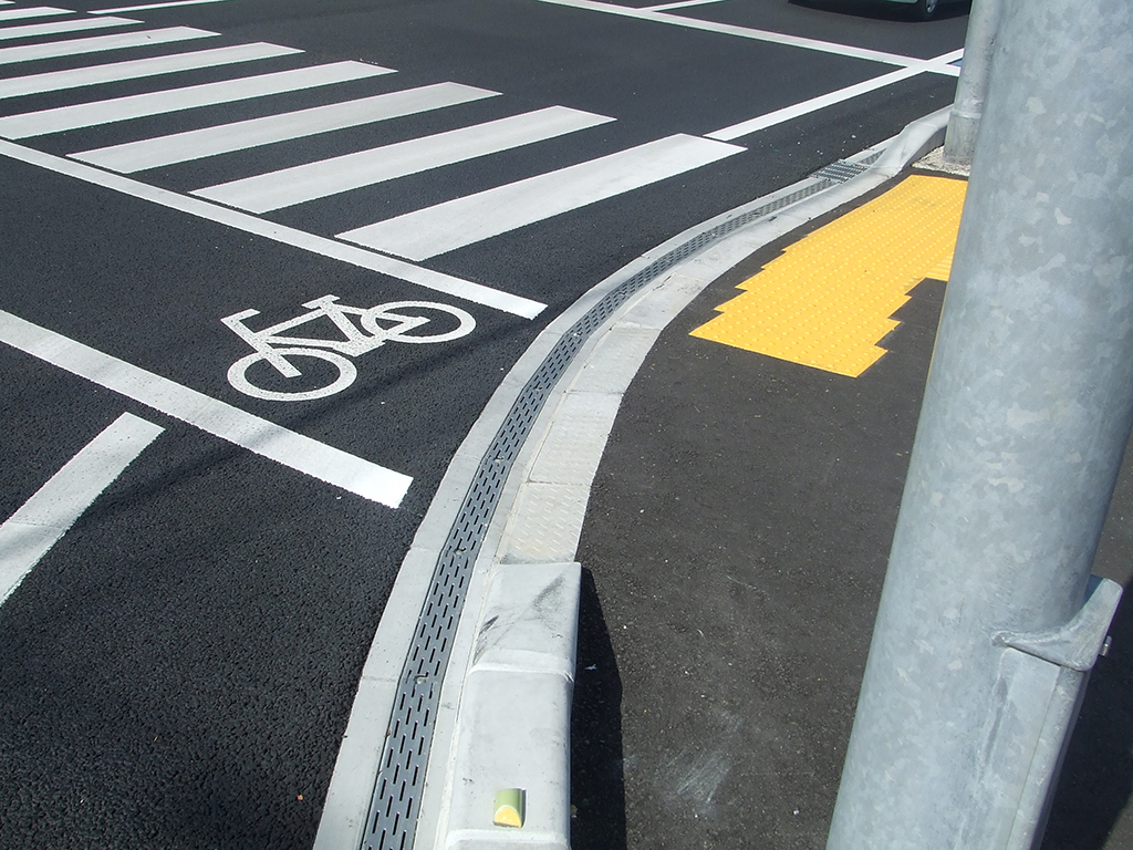 エプロン幅が狭く、L型側溝より有効幅員が広がる。エプロン勾配も2%と緩やかで段差がなく、自転車レーンにも適用可能。