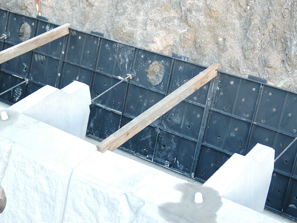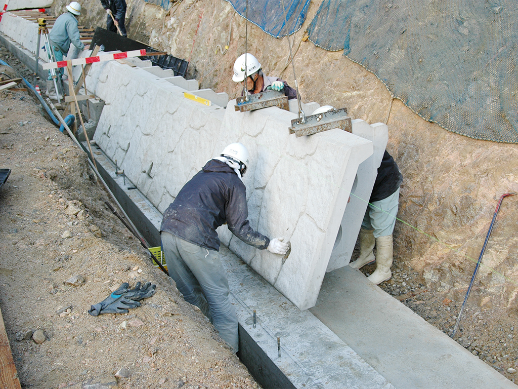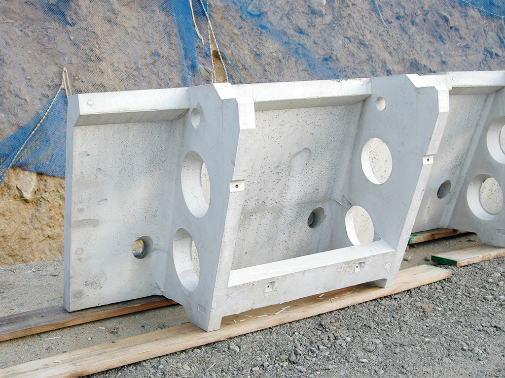 工場でインサートを埋め込んだブロックとKCパネル(専用裏型枠)を現地でセパレータを介して連結。これにより型枠の組立・解体作業が不要となり、工程を短縮可能。