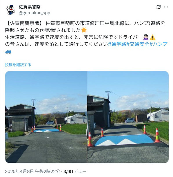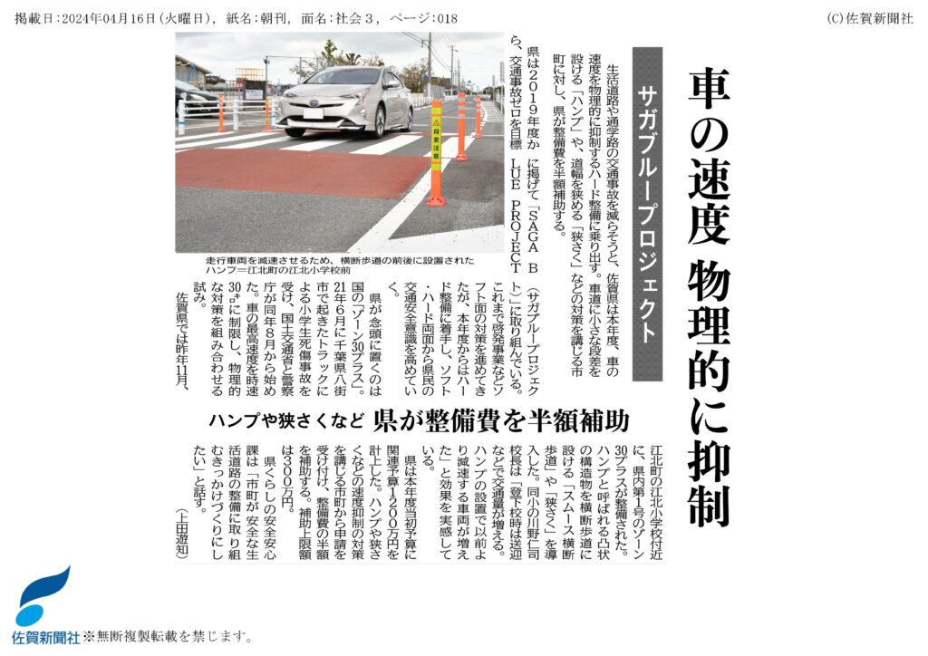 ※平成15年に国土交通省と佐賀大学の社会実験より、サイン曲線ハンプの効果が実証されました。